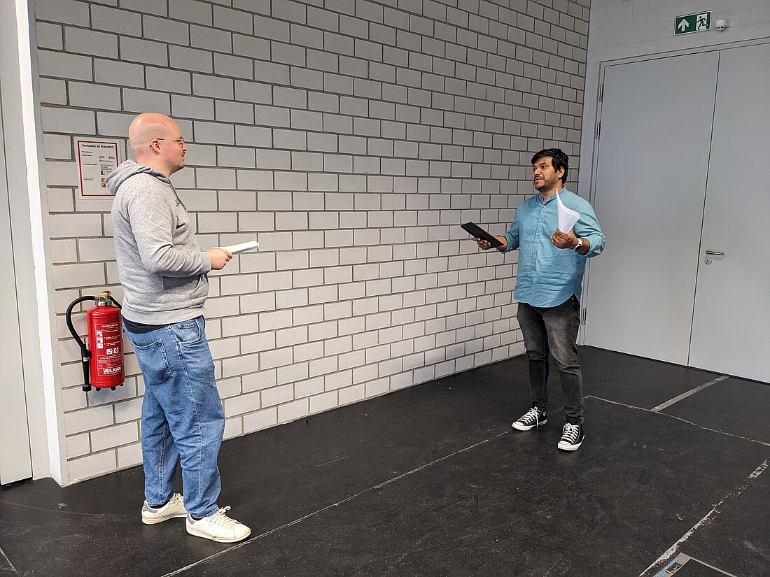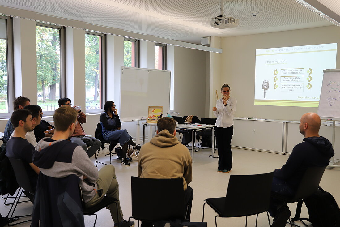 Giving presentations - or more generally talking in front of people - is required for all researchers. On 10th October, we had the workshop “Voice and Language” given by Franziska Trischler at KIT to prepare for that. The workshop focused on the use of voice and posture, which was trained by practical exercises